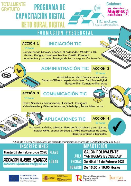 Romancos, a través de la Asociación de Mujeres y en colaboración con el Ayuntamiento, se une al proyecto TIC incluye Castilla-La Mancha Rural que tiene como meta la inclusión digital de la ciudadanía que vive e... Leer Más